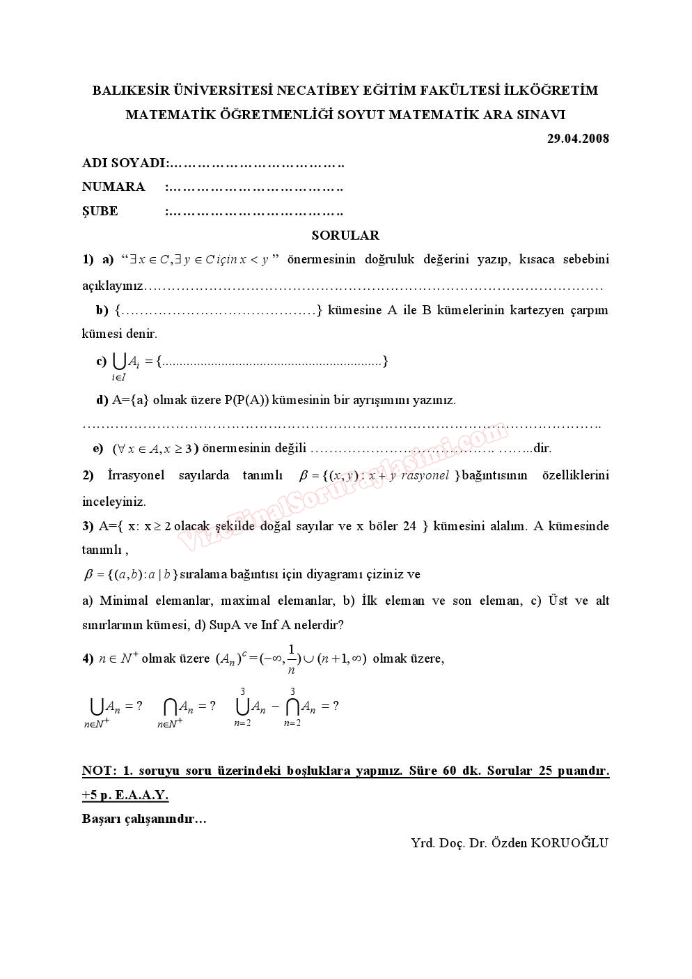 Vize ve Final Soruları / Balıkesir Üniversitesi / Soyut Matematik -1