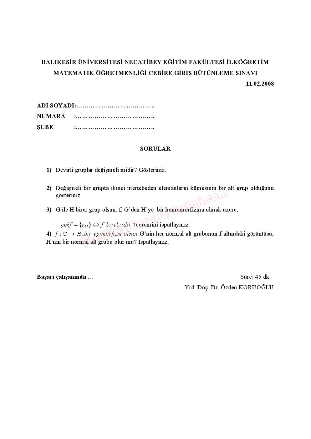 cebire giriş bütünleme soruları Balıkesir Üniversitesi