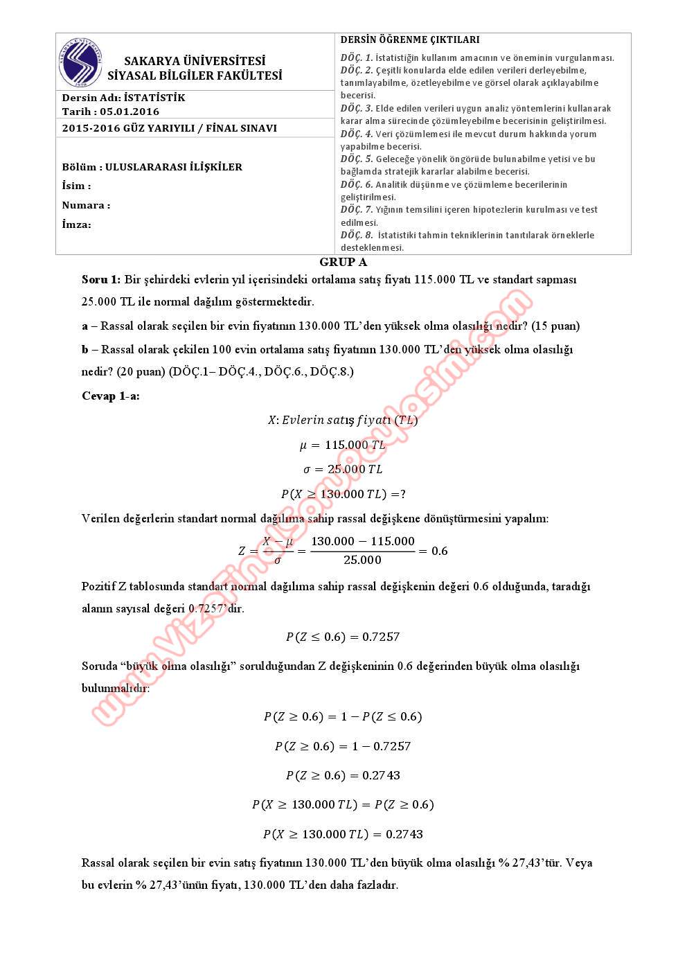 İstatistik Dersi Final Soruları Sakarya Üniversitesi A Grubu GERİ DÖN-