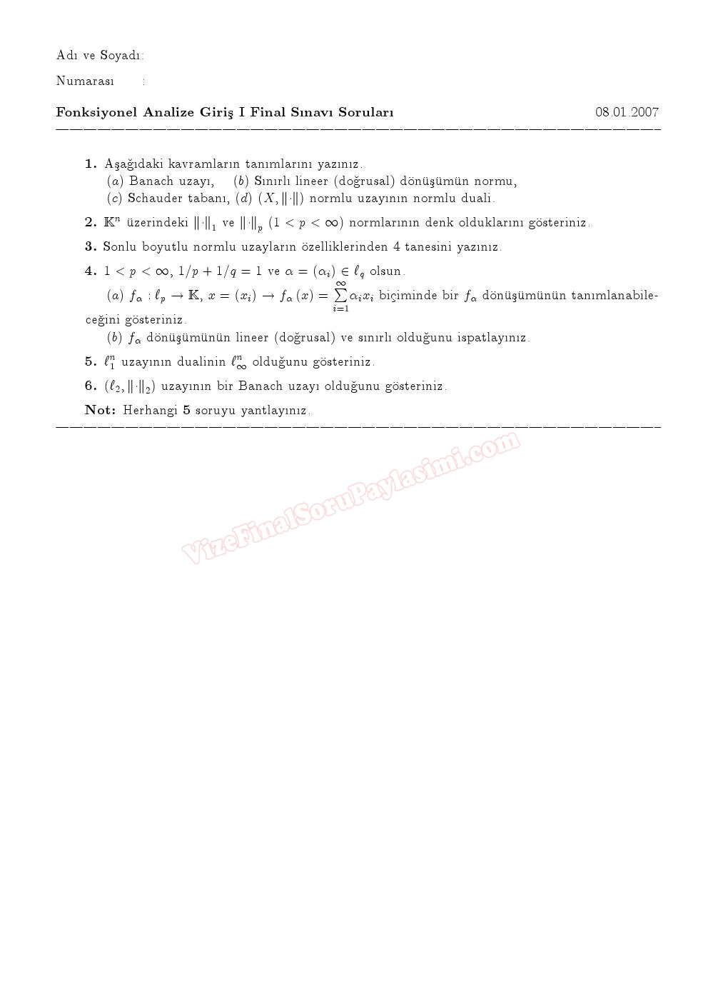 Vize ve Final Soruları / Pamukkale Üniversitesi / Fonksiyonel Analize Giriş -1