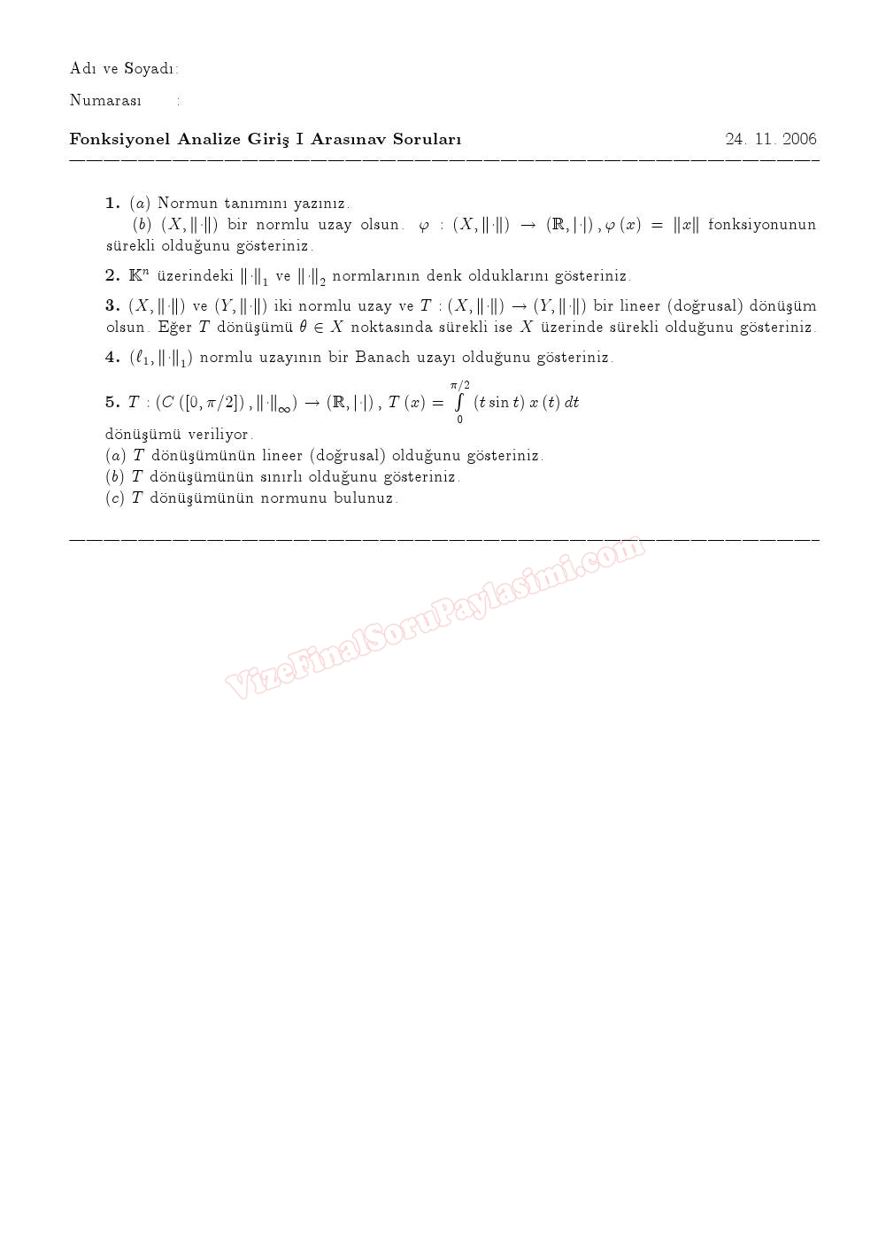 Vize ve Final Soruları / Pamukkale Üniversitesi / Fonksiyonel Analize Giriş -1