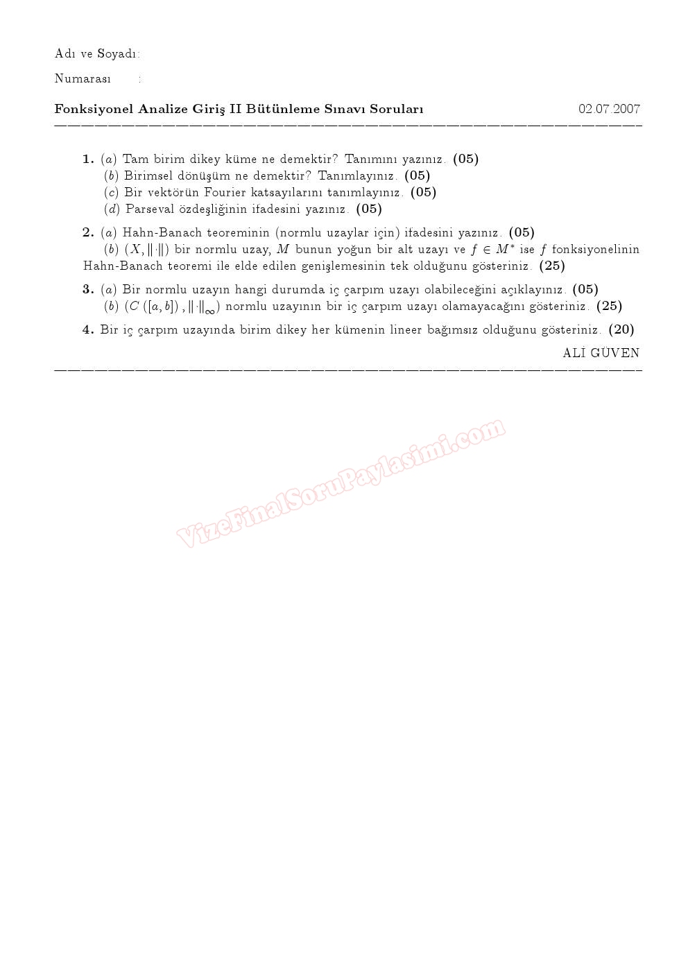 Vize ve Final Soruları / Pamukkale Üniversitesi / Fonksiyonel Analize Giriş -2