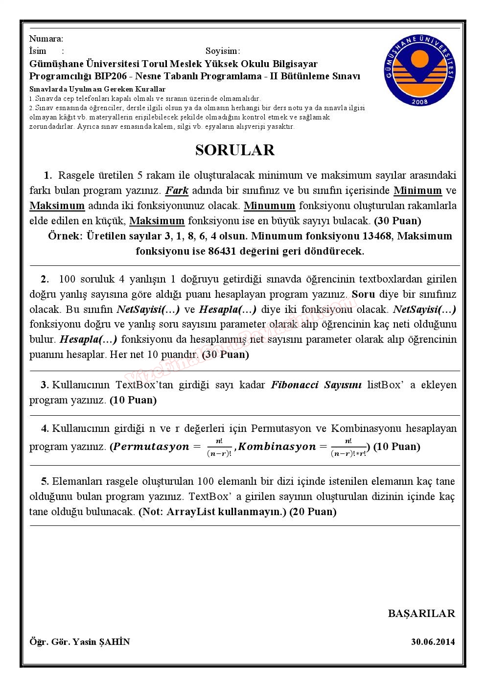 Vize ve Final Soruları / Gümüşhane Üniversitesi / Nesne Tabanlı Programlama –2