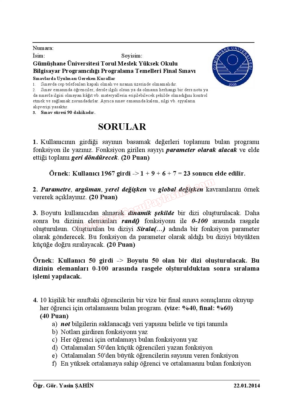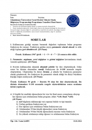 Vize ve Final Soruları / Gümüşhane Üniversitesi / Programlama Temelleri Dersi