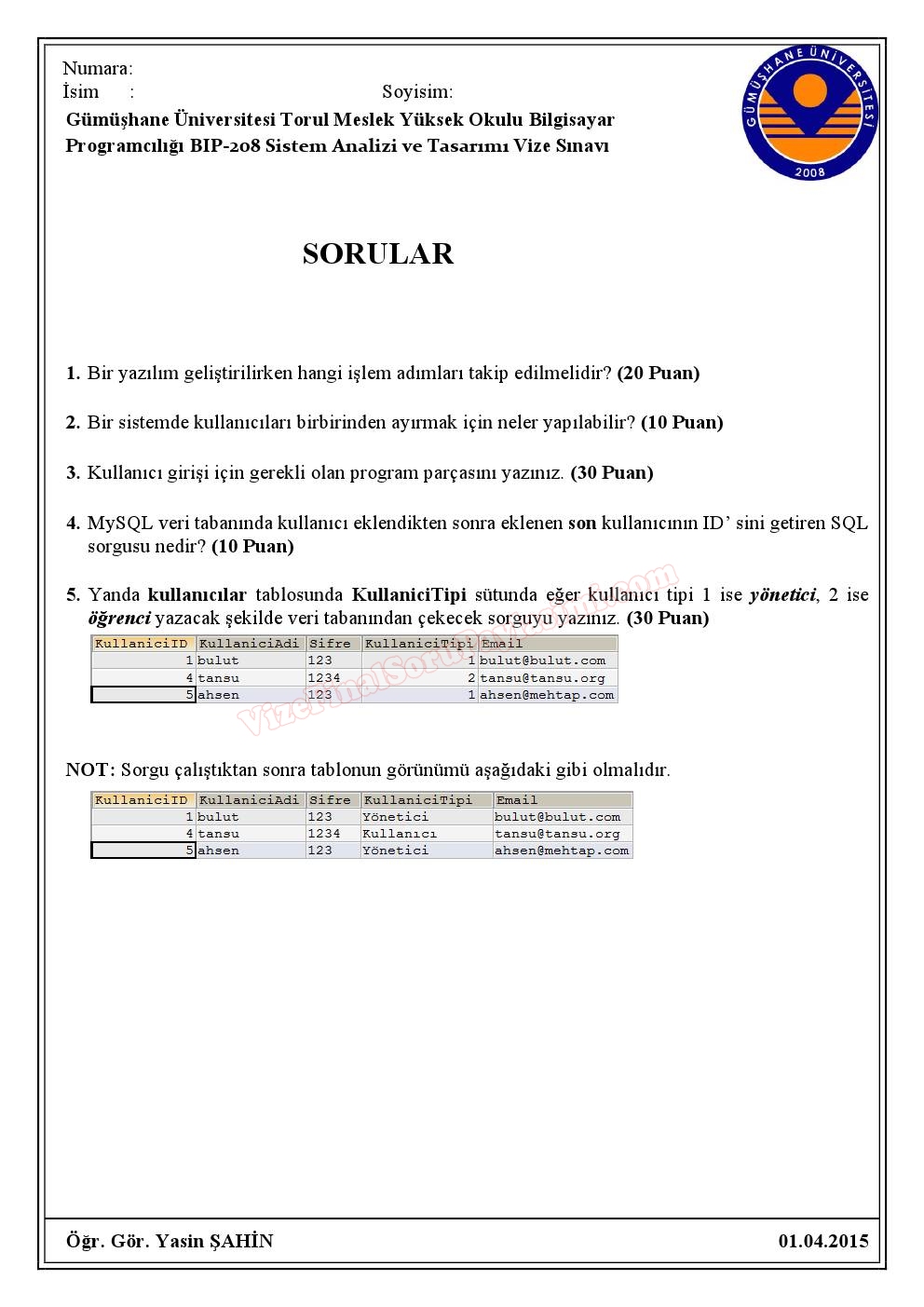 Vize ve Final Soruları / Gümüşhane Üniversitesi / Sistem Analizi ve Tasarımı Dersi