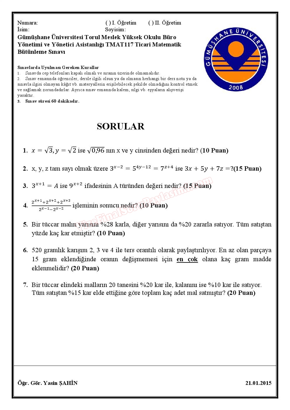 ticari matematik Bütünleme Soruları Gümüşhane Üniversitesi