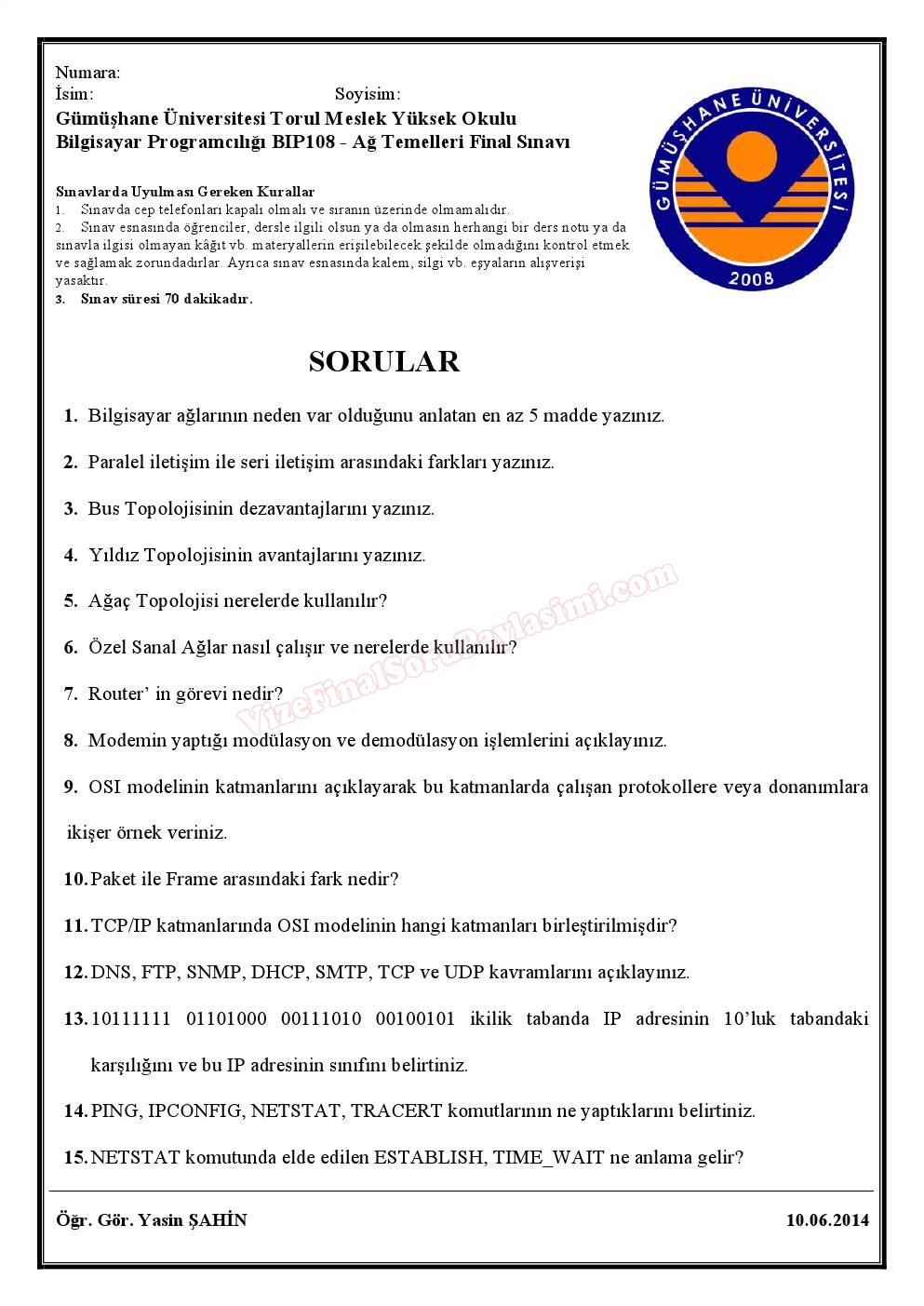 Vize ve Final Soruları / Gümüşhane Üniversitesi / Ağ Temelleri Dersi