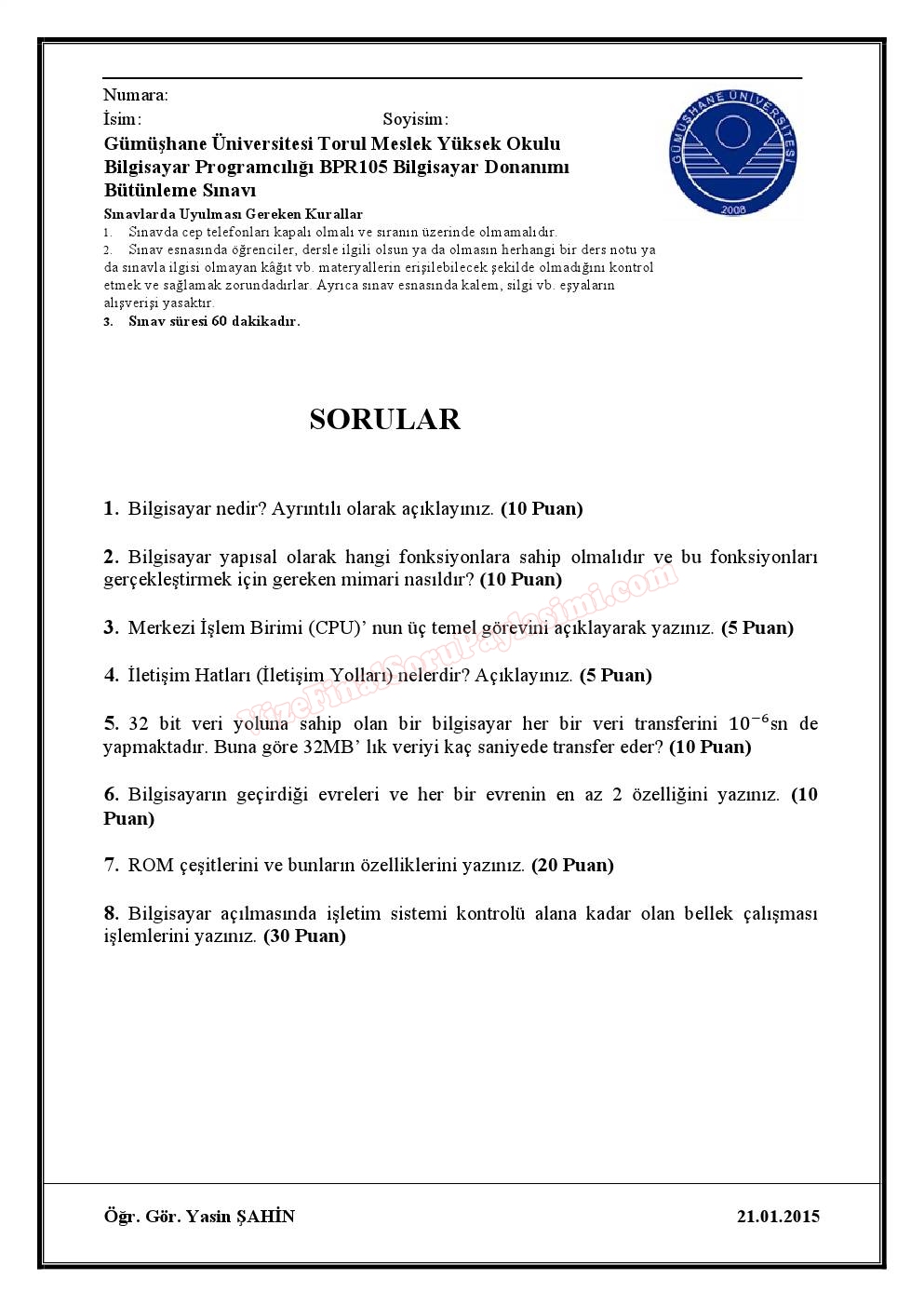 bilgisayar donanımı Bütünleme Soruları Gümüşhane Üniversitesi