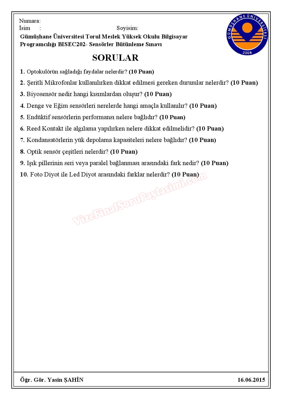 Vize ve Final Soruları / Gümüşhane Üniversitesi / Sensörler Dersi