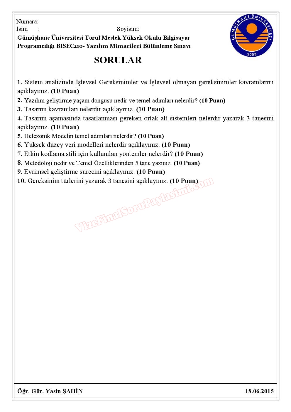 Vize ve Final Soruları / Gümüşhane Üniversitesi / Yazılım Mimarileri Dersi