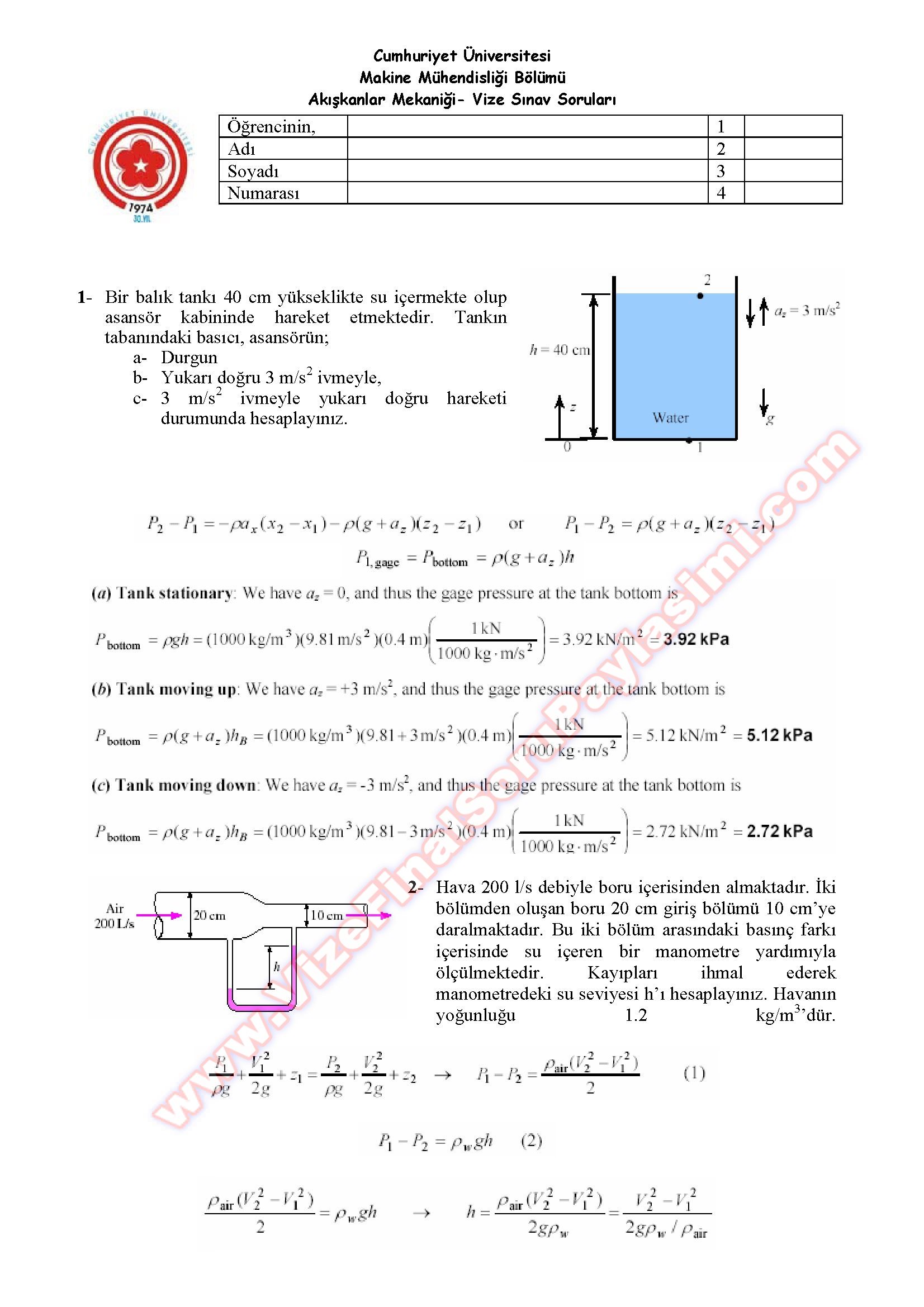 Vize ve Final Soruları / Cumhuriyet Üniversitesi / Akışkanlar Mekaniği
