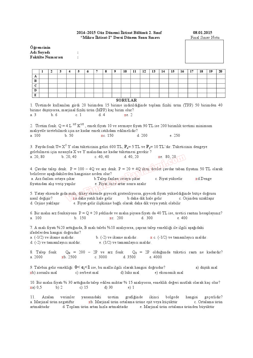 Mikro İktisat-1 Final Soru ve Cevapları 2015