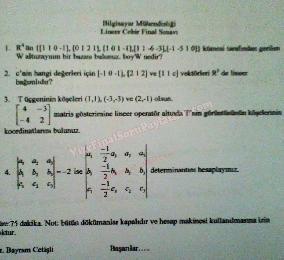 Vize ve Final Soruları / Süleyman Demirel Üniversitesi / Lineer Cebir Dersi