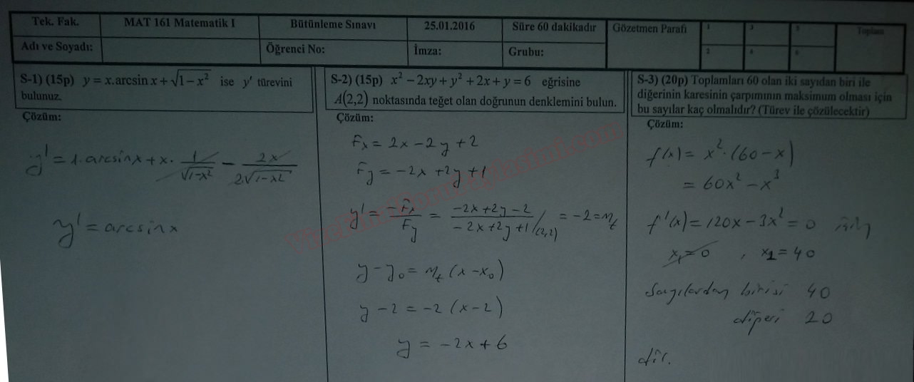 Matematik-1 Bütünleme Soruları Cevapları 2016 Teknoloji Fakültesi GERİ DÖN-