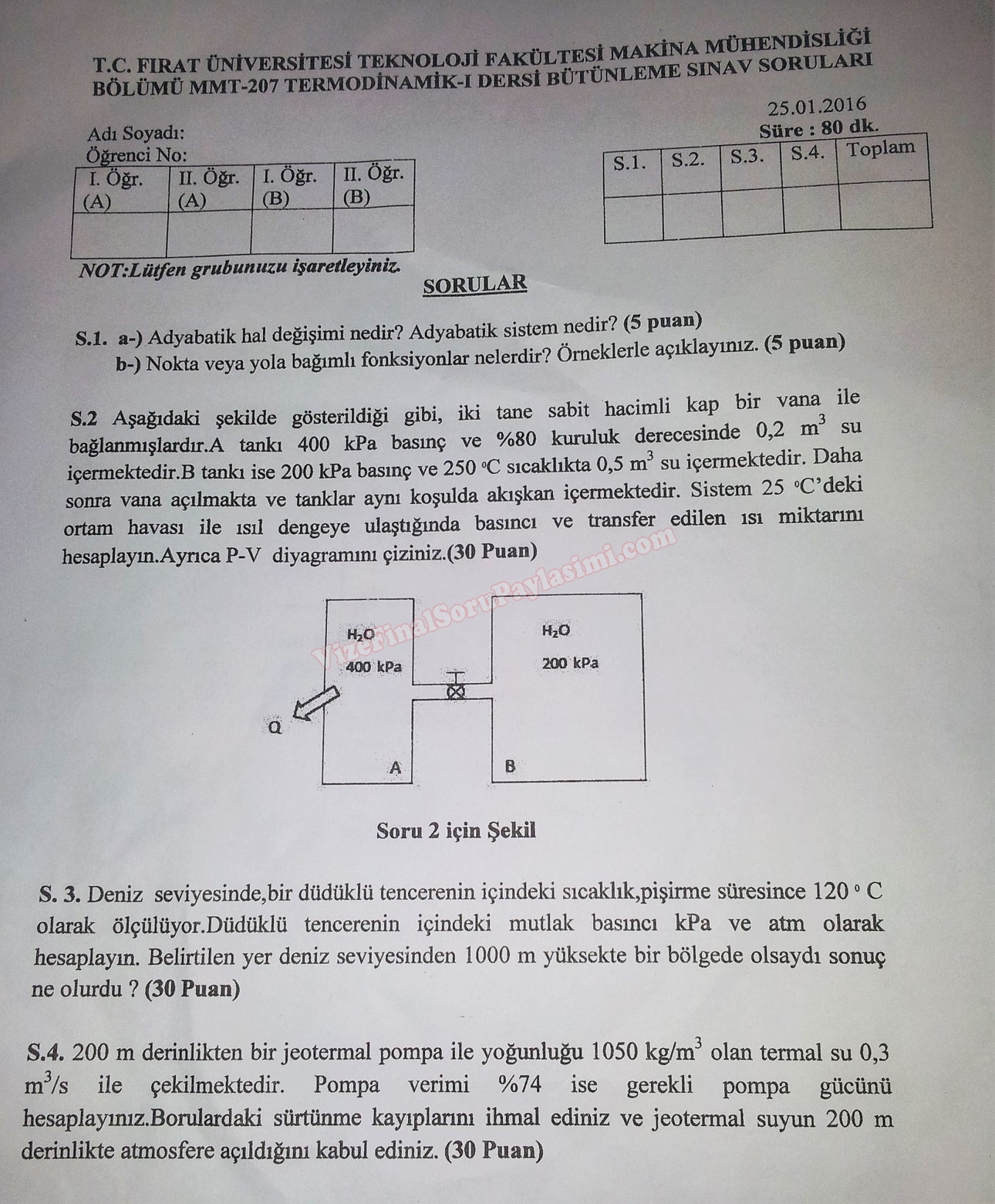 Termodinamik -1 Bütünleme Soruları 2016 Fırat Üniversitesi