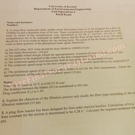 Unit Operations -1 Final Exam Questions Kocaeli Üniversitesi Temel İşlemler -1 Dersi