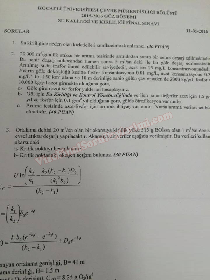 Vize ve Final Soruları / Kocaeli Üniversitesi / Su Kalitesi ve Kirliliği Dersi