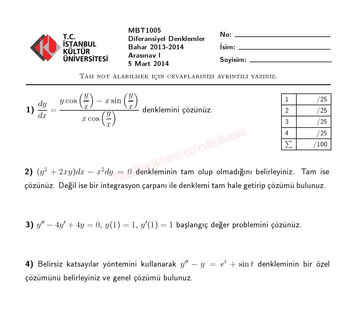 Vize ve Final Soruları / İstanbul Kültür Üniversitesi / Diferansiyel Denklemler Dersi