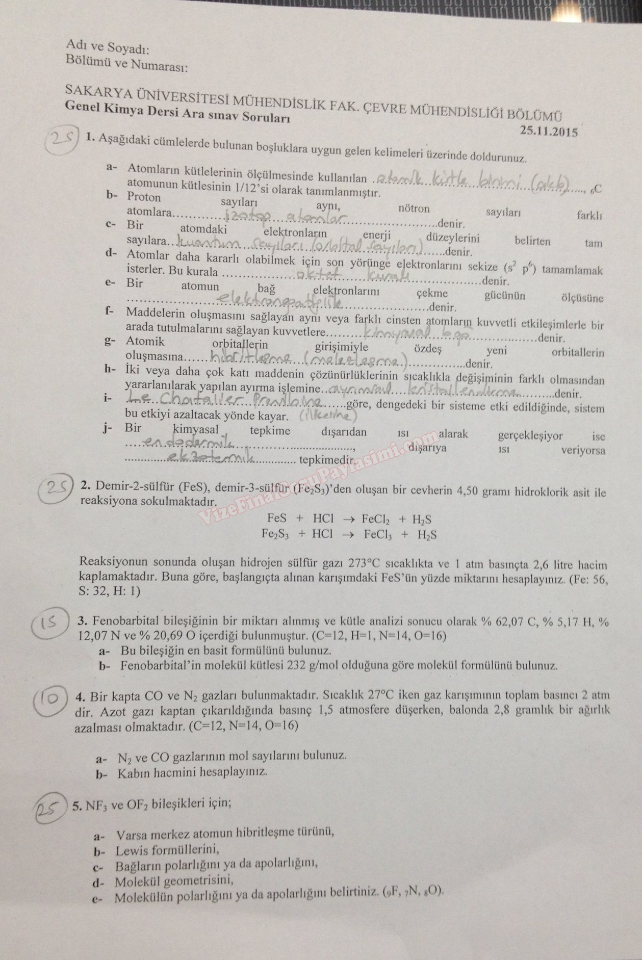 Sakarya Üniversitesi Genel Kimya Dersi Vize Soruları Cevapları 2015