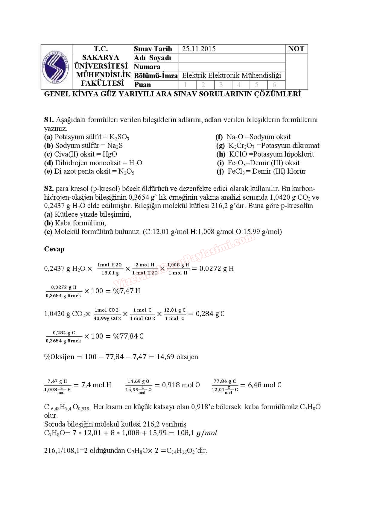 Genel Kimya Dersi Vize Soruları Cevapları 2015 Sakarya Üniversitesi GERİ DÖN-