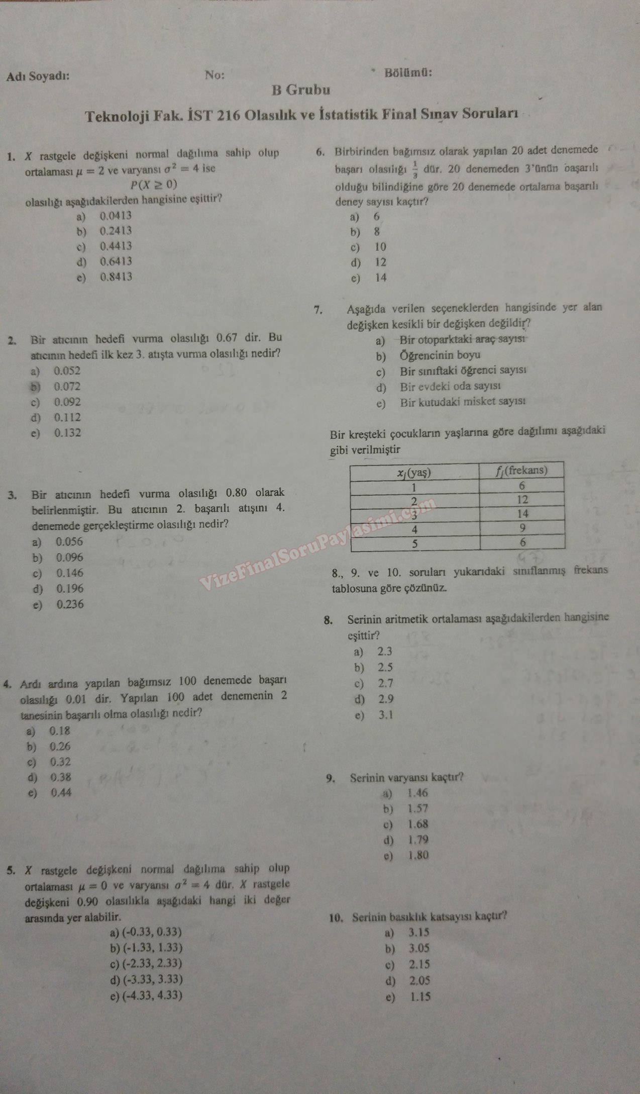 Olasılık ve İstatistik Dersi Final Soruları - 2016