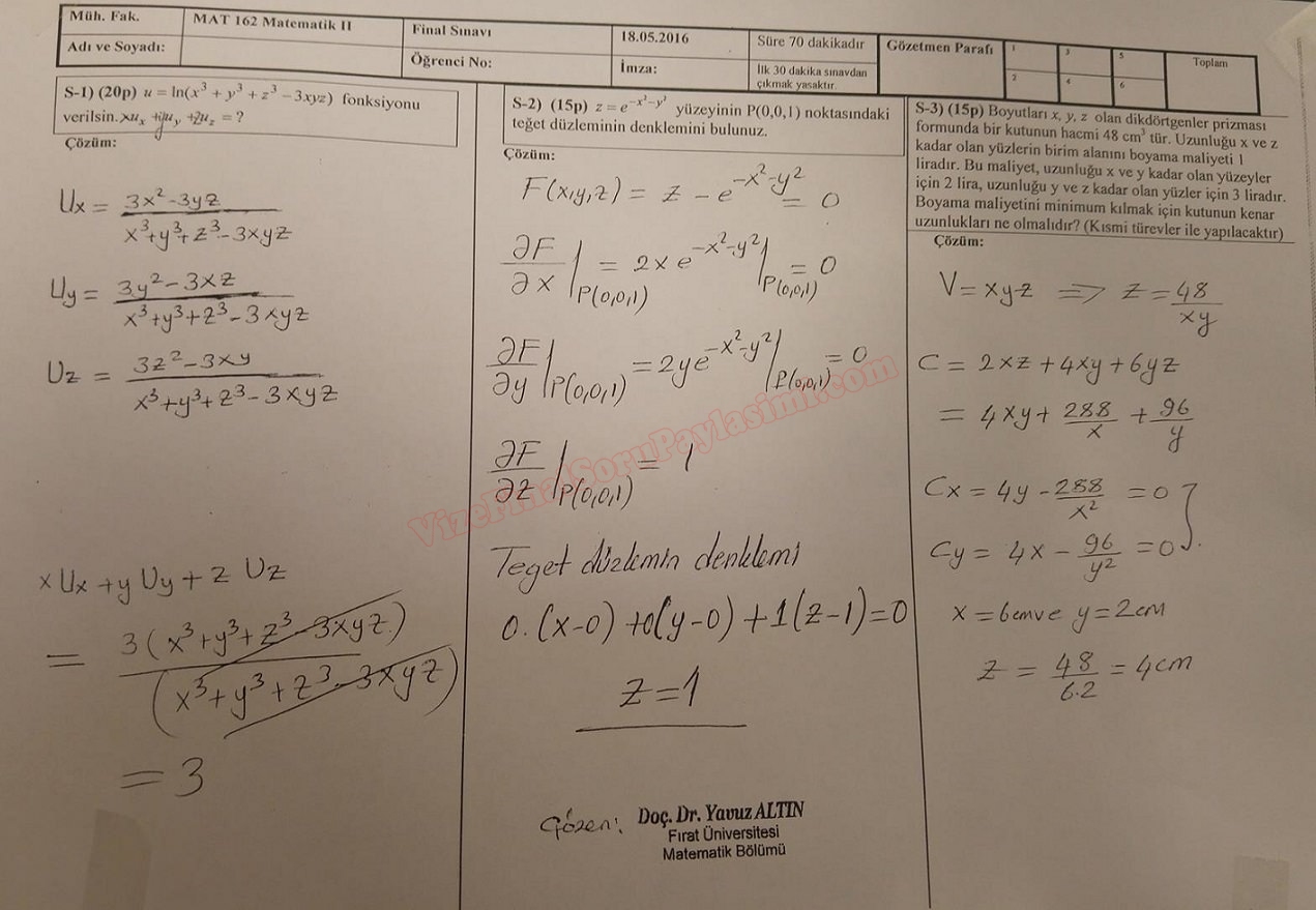 Matematik -2 Final Soruları Çözümleri 2016 Fırat Üniversitesi Mühendislik Fakültesi GERİ DÖN-