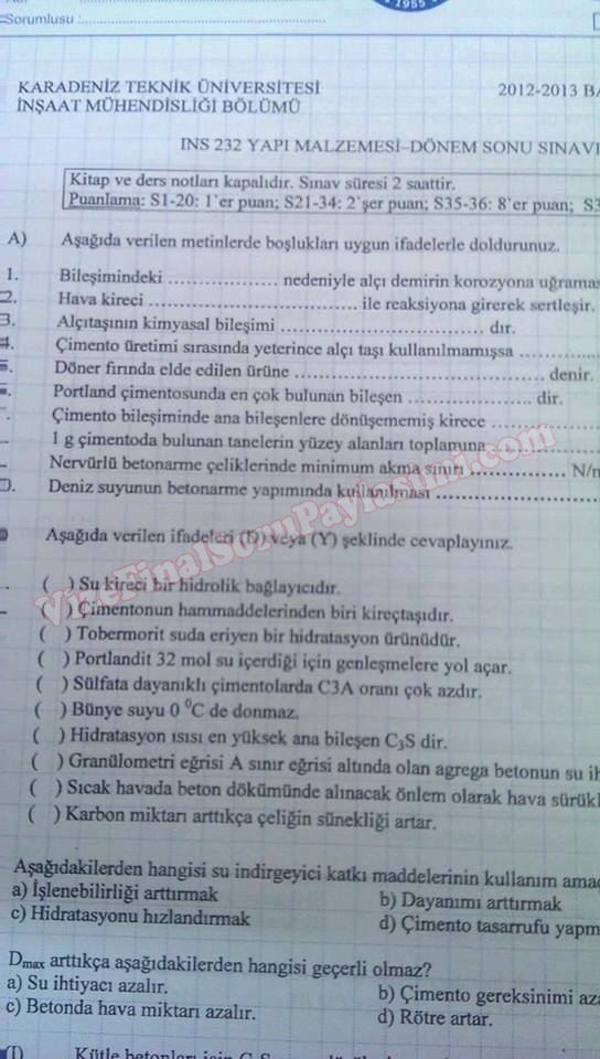 Vize ve Final Soruları / Karadeniz Teknik Üniversitesi / Yapı Malzemesi Dersi