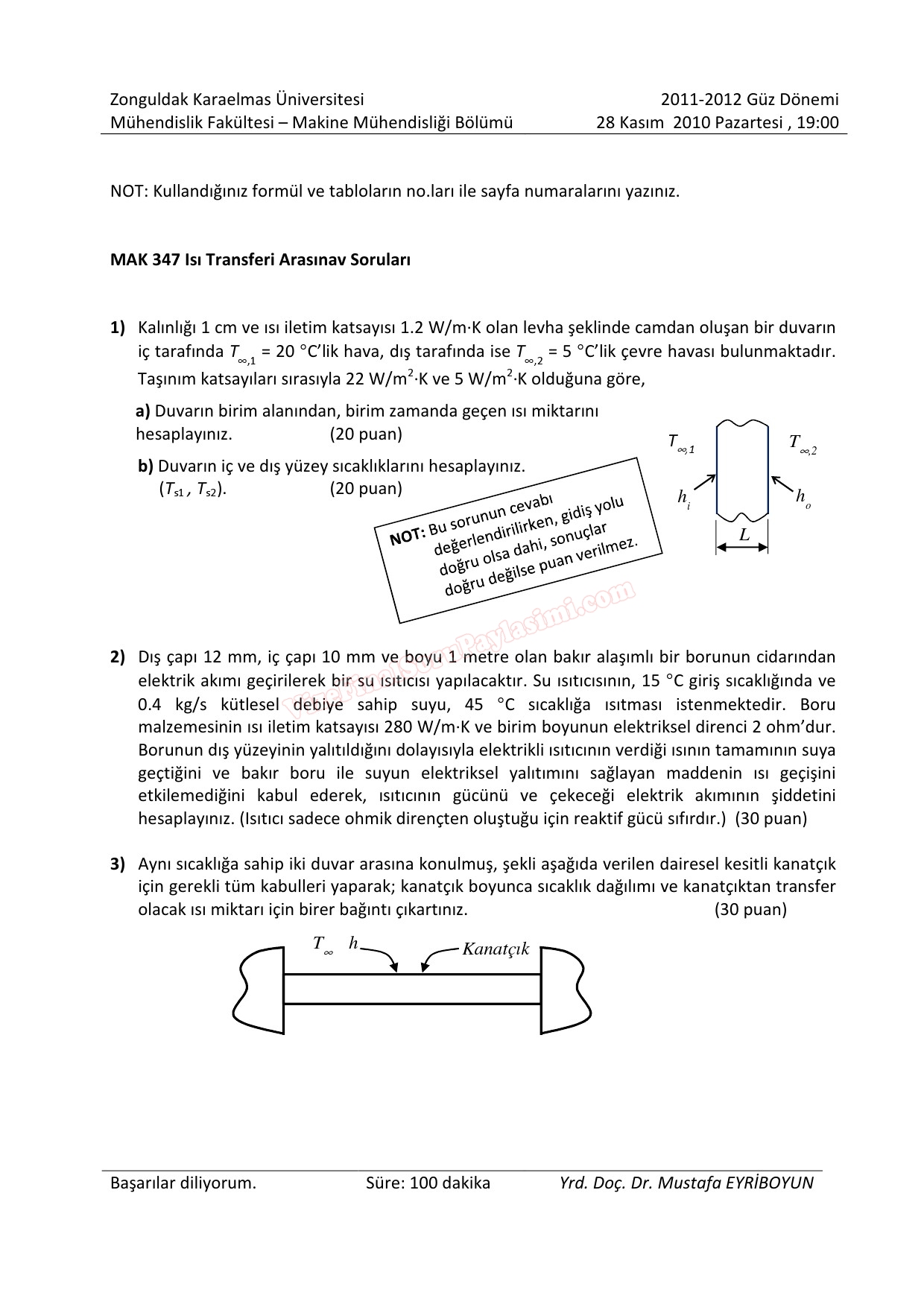 Bülent Ecevit Üniversitesi Isı Transferi Dersi vize soruları GERİ DÖN-