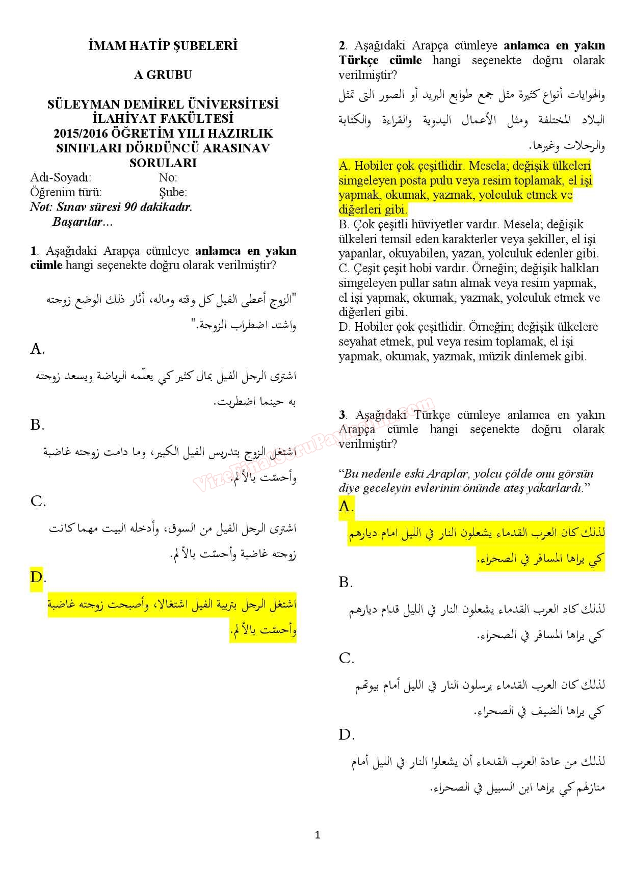 Süleyman Demirel Üniversitesi İlahiyat Fakültesi Arapça Hazırlık Vize Soruları Cevapları GERİ DÖN-