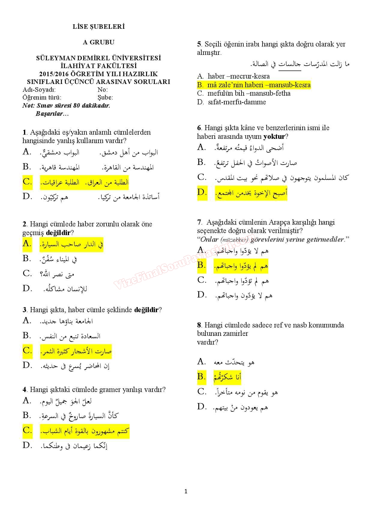 Süleyman Demirel Üniversitesi İlahiyat Fakültesi Arapça Hazırlık Vize Soruları Cevapları 2016 GERİ DÖN-