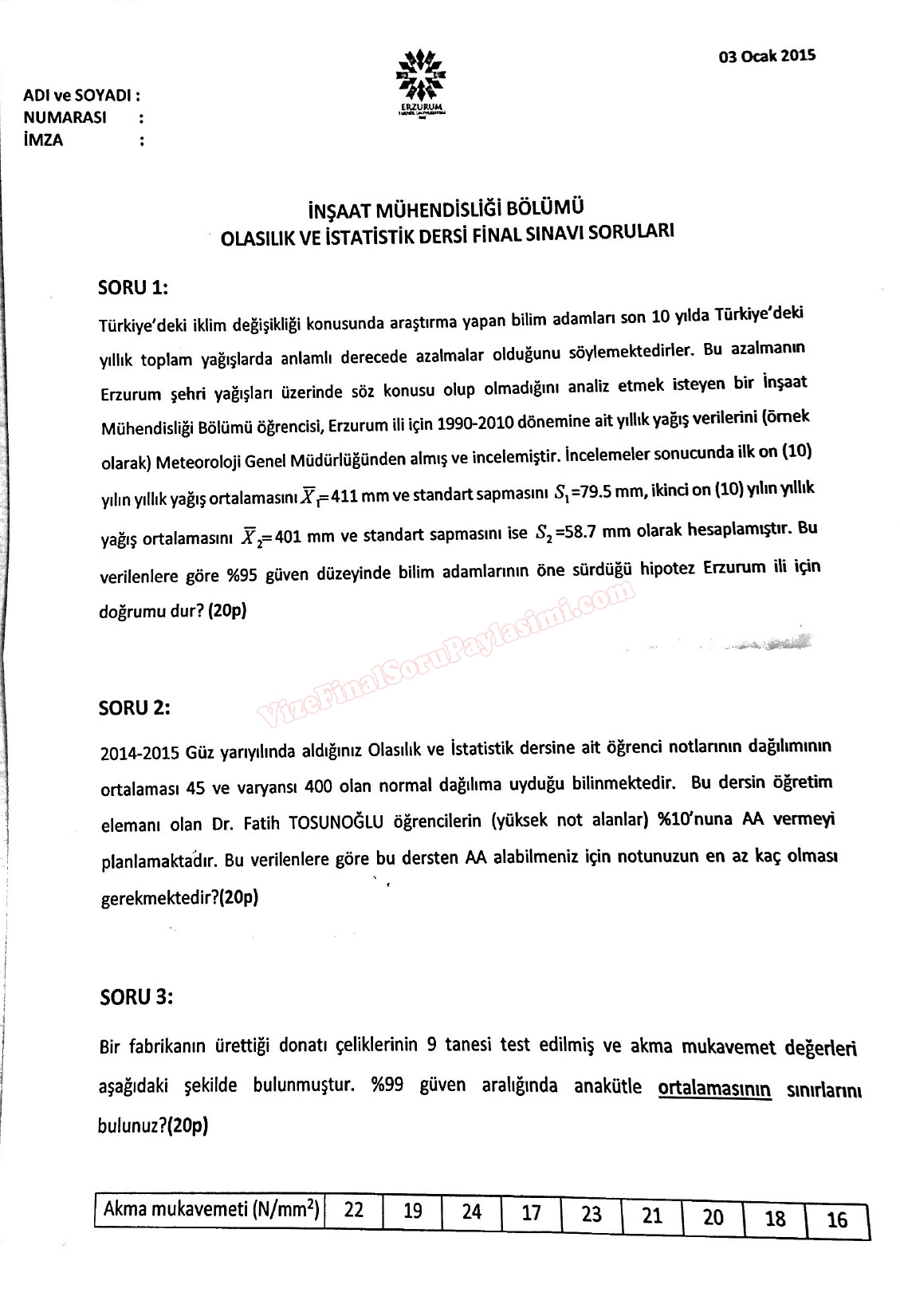 İstatistik ve Olasılık Final Soruları ve Cevapları 11-11-2015, 15:04
