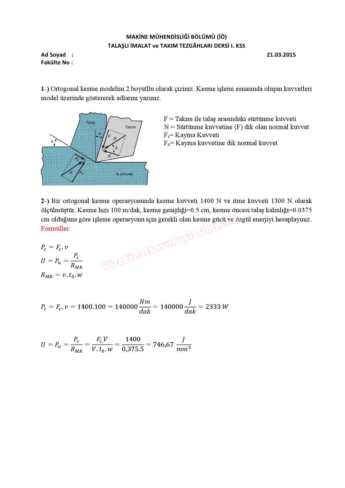 Talaşlı İmalat ve Takım Tezgahları 1.Kısa Sınav Soruları 29-11-2016, 02:14