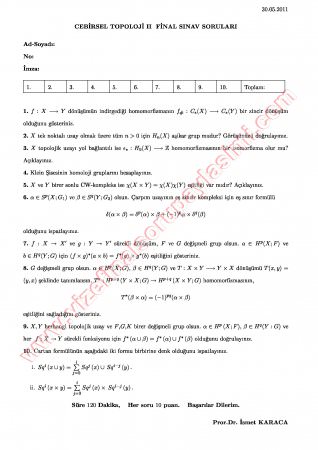 Cebirsel Topoloji-2 Final Soruları-2011 27-04-2015, 16:58