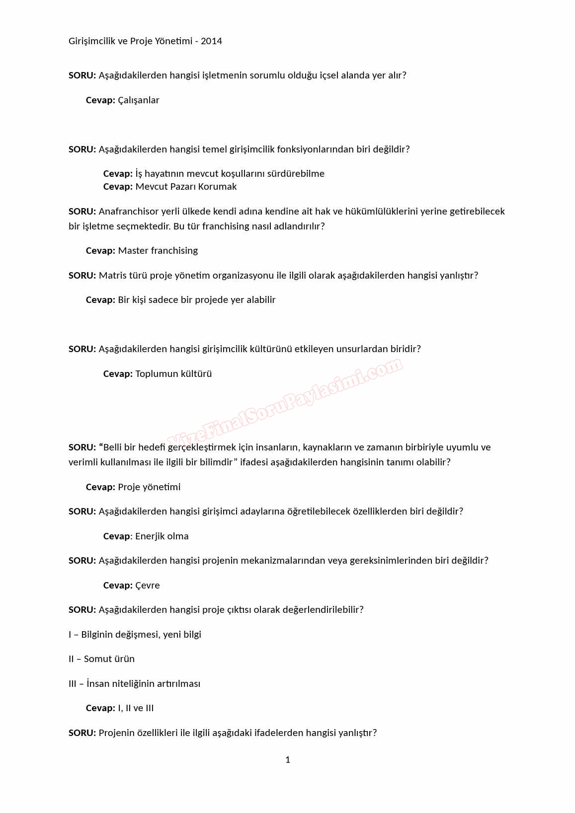 Proje Yönetimi ve Girişimcilik Dersi Final Soruları 4-12-2015, 19:13