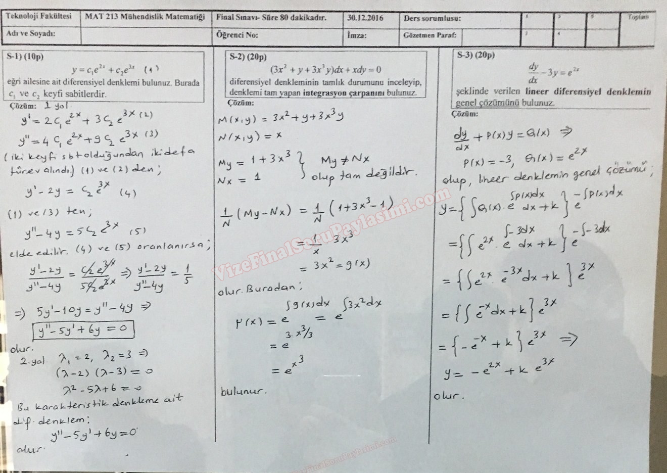 Mühendislik Matematiği Diferansiyel Denklemler Final Soruları ve Cevapları Çözümleri GERİ DÖN-
