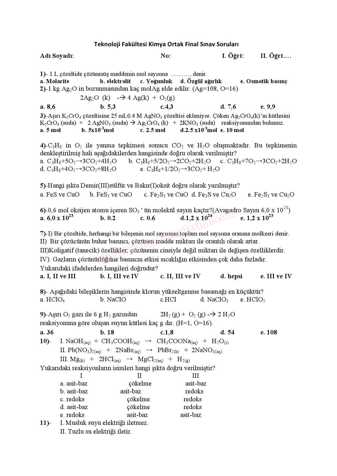 Kimya Dersi Final Soruları 2017 Fırat Üniversitesi Test Soruları GERİ DÖN-