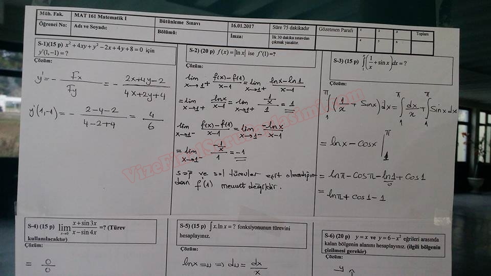 Matematik -1 Bütünleme Soruları ve Cevapları -Müh. Fakültesi 27-01-2016, 16:30