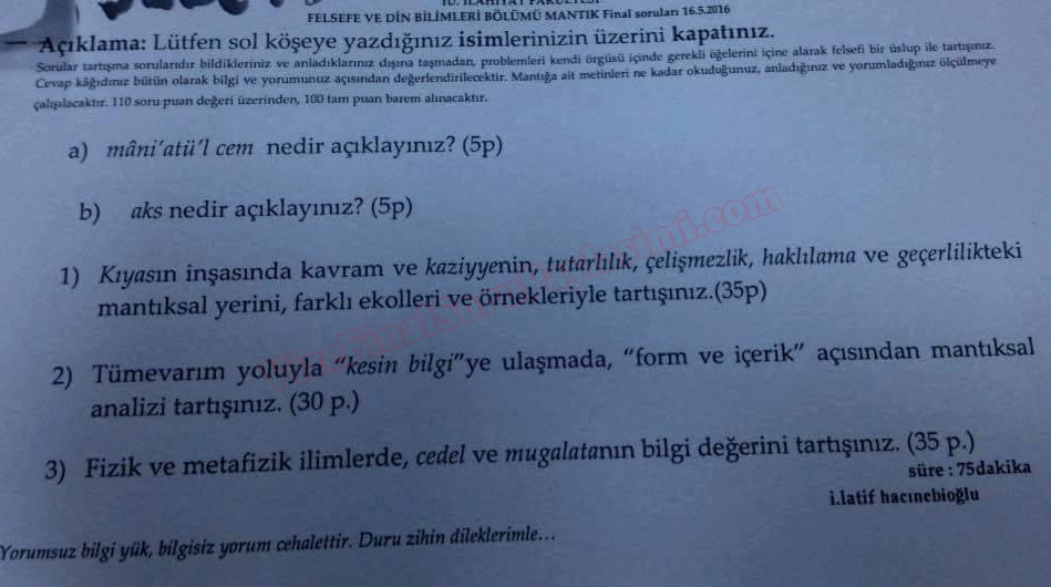 mantık dersi final soruları İlahiyat Fakültesi 2016 İstanbul Üniversitesi