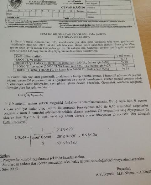 Sakarya Üniversitesi arasınav soruları bilgisayar programlama