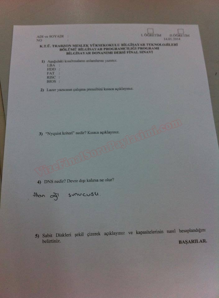Karadeniz Teknik Üniversitesi TMYO bilgisayar donanımı Final Soruları