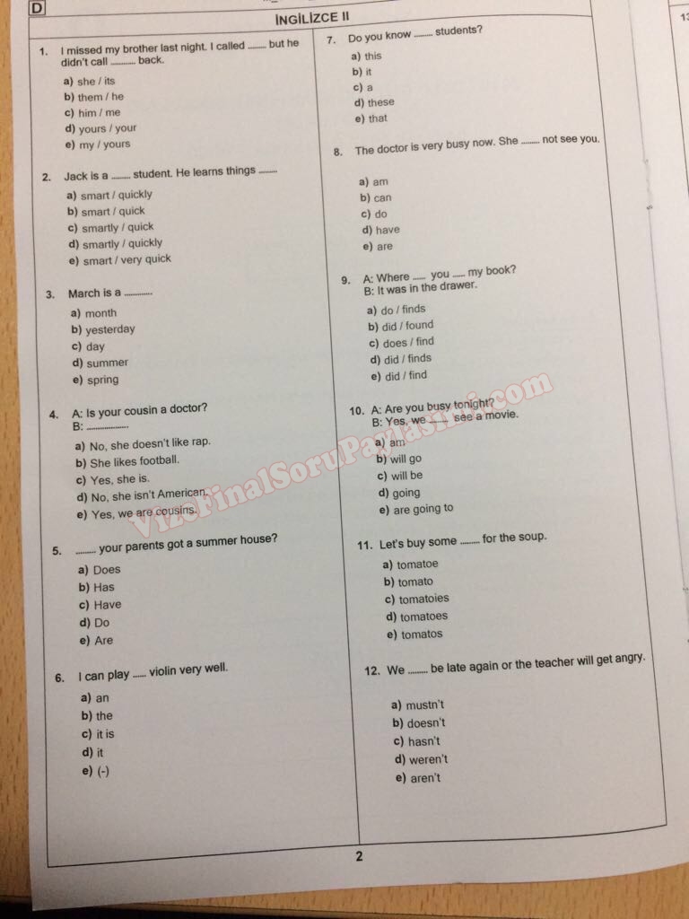İngilizce -2 Final Soruları