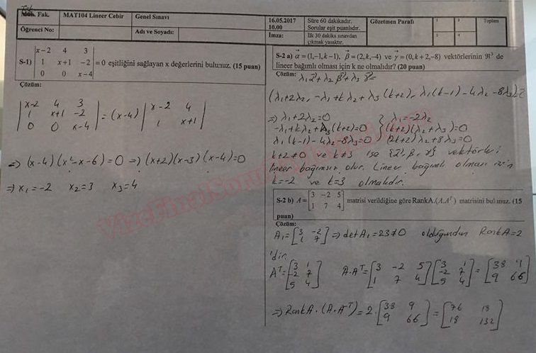 Lineer Cebir Final Soruları ve Çözümleri - 2017