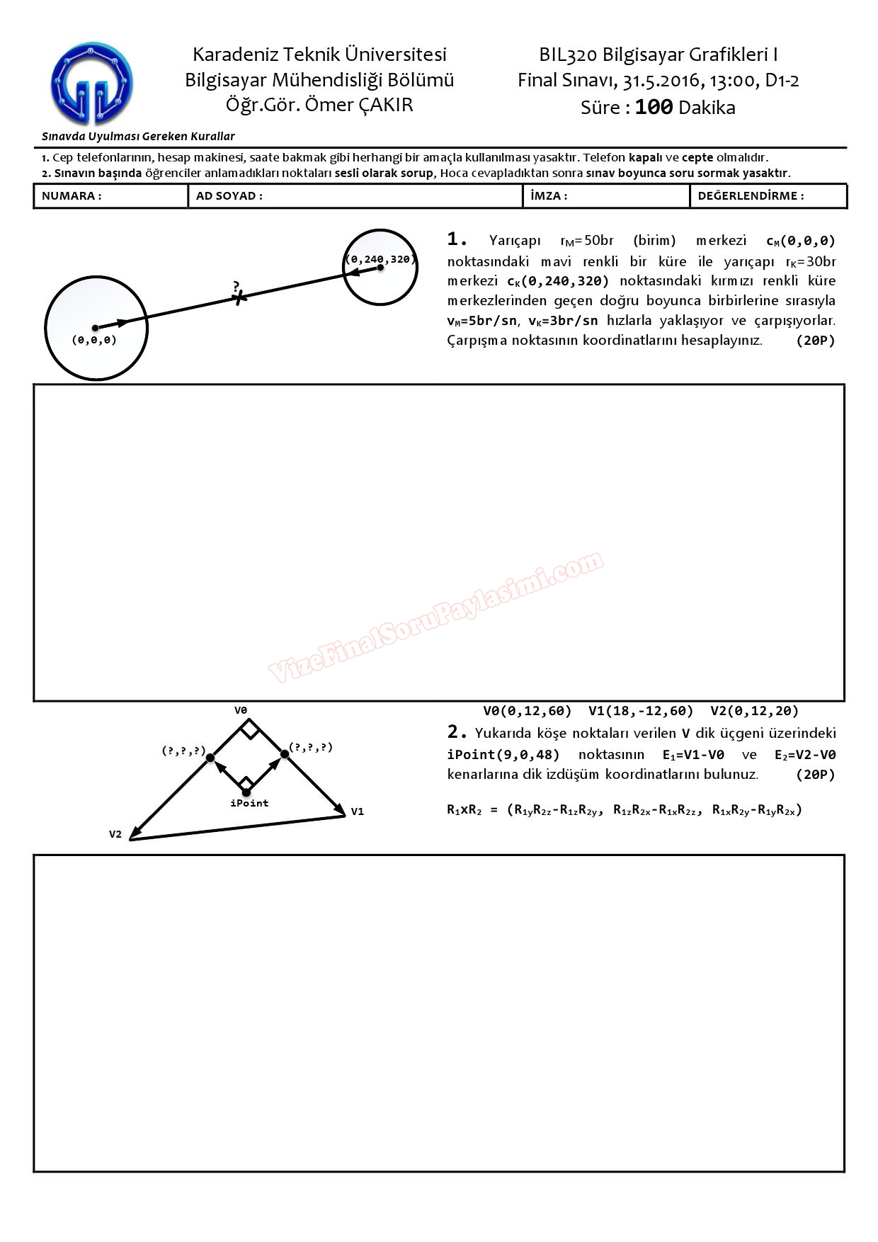 Bilgisayar Grafikleri-1 Final Soru ve Cevapları 2016 Karadeniz Teknik Üniversitesi GERİ DÖN-