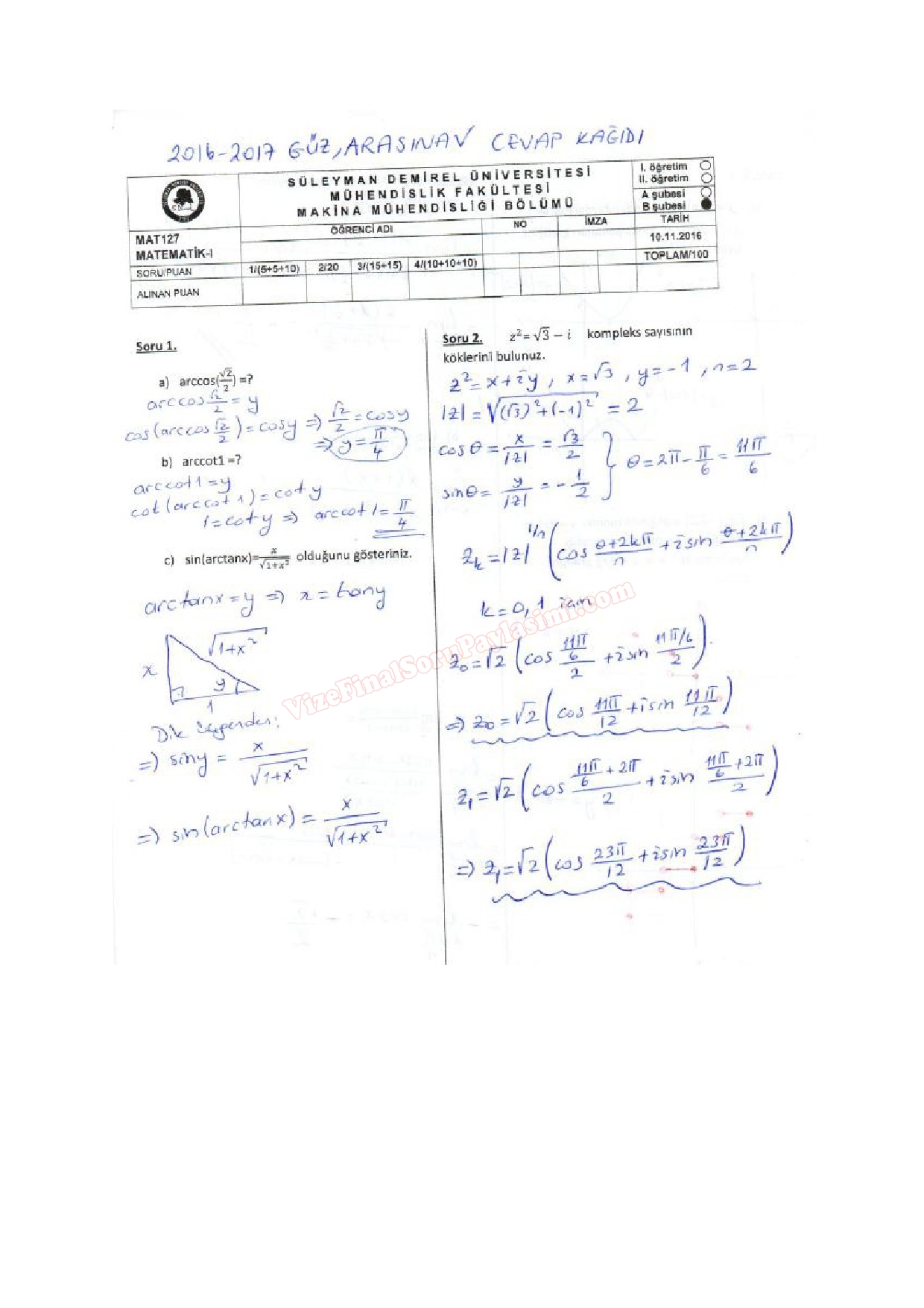 Matematik -1 Arasınav Soruları Vize Soru ve Cevapları Süleyman Demirel Üniversitesi 2016 GERİ DÖN-