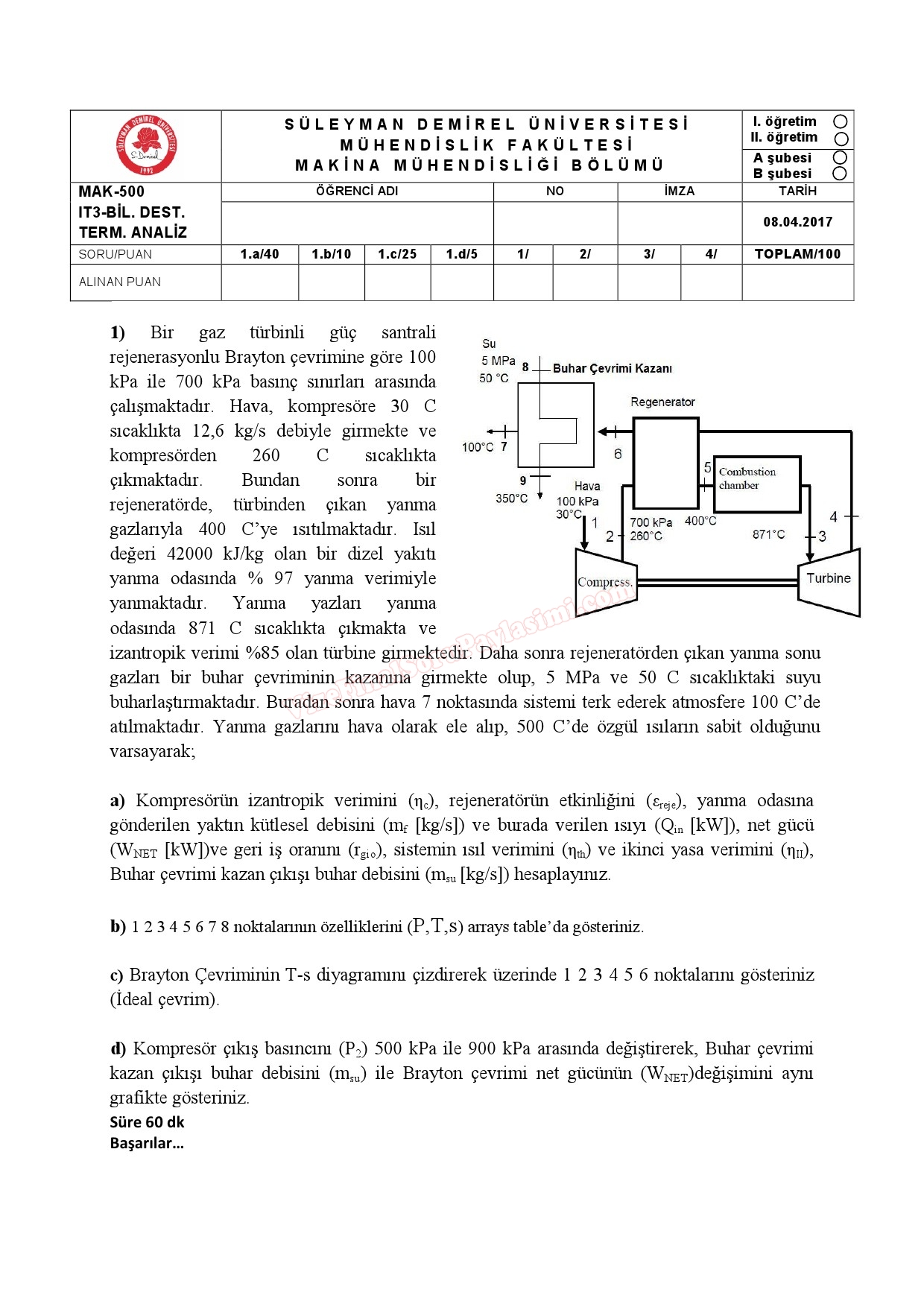 Vize ve Final Soruları / Süleyman Demirel Üniversitesi / Bilgisayar Destekli Termodinamik Analiz