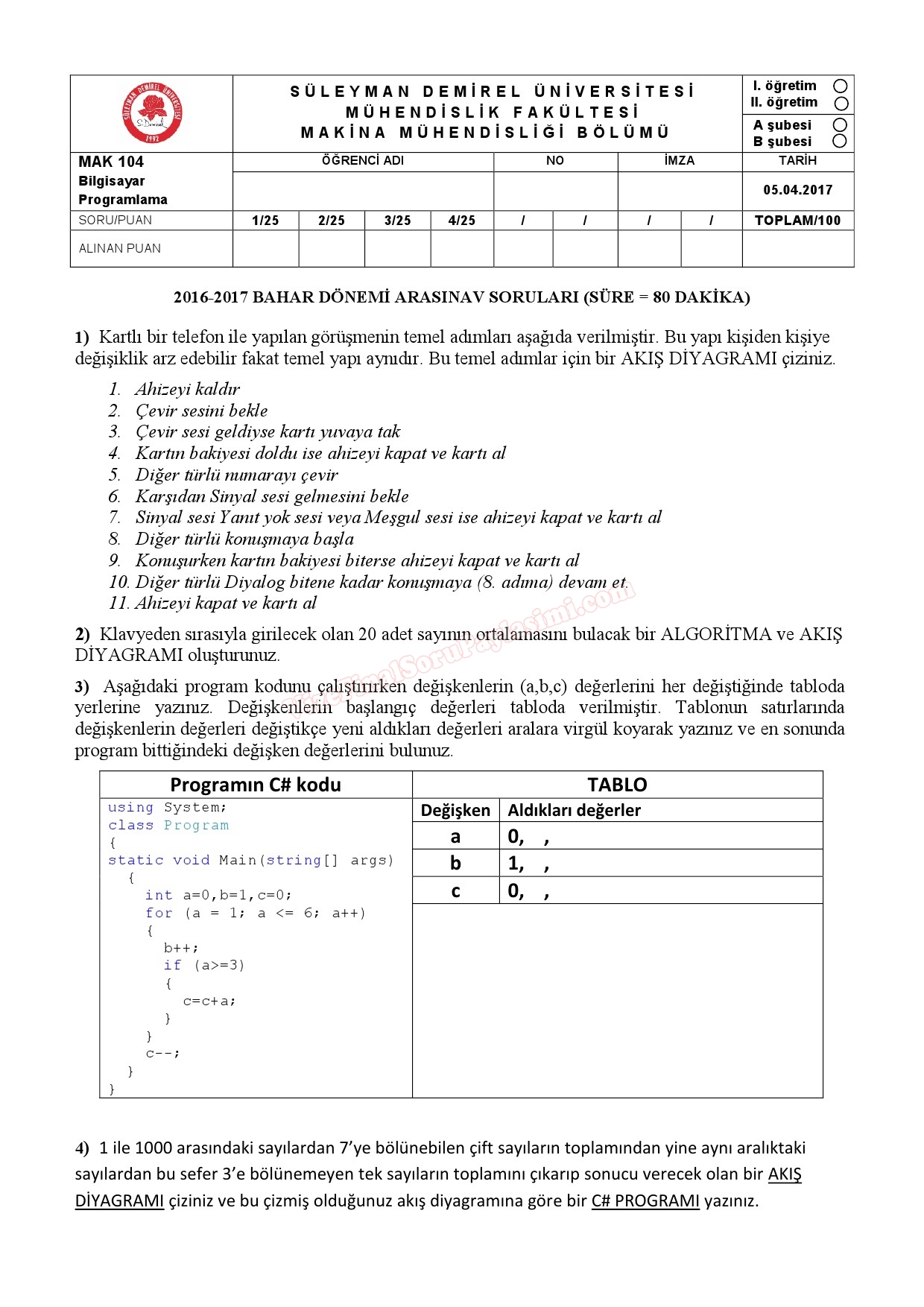 Dersi Vize Soruları Cevapları 2017 Süleyman Demirel Üniversitesi SDÜ Arasınav Soruları Bilgisayar Programlama GERİ DÖN-