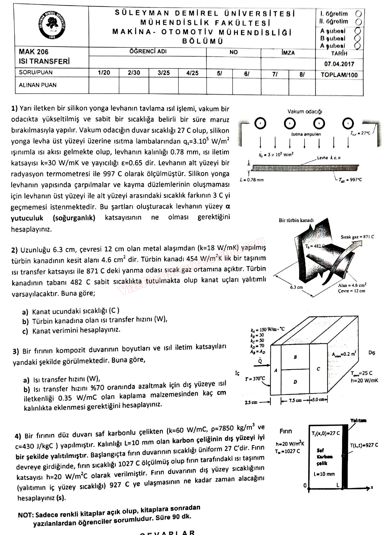 Isı Transferi Dersi Vize Soruları ve Cevapları Süleyman Demirel Üniversitesi SDÜ 2017 GERİ DÖN-