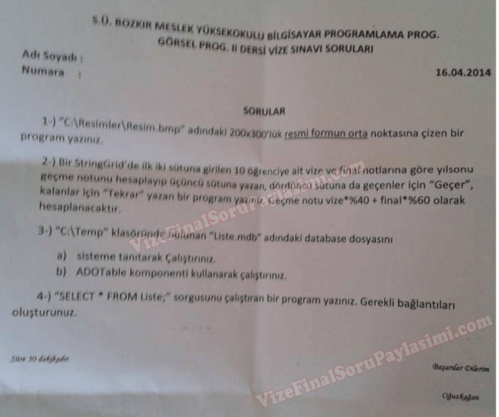 Vize ve Final Soruları / Selçuk Üniversitesi / Görsel Programlama -2
