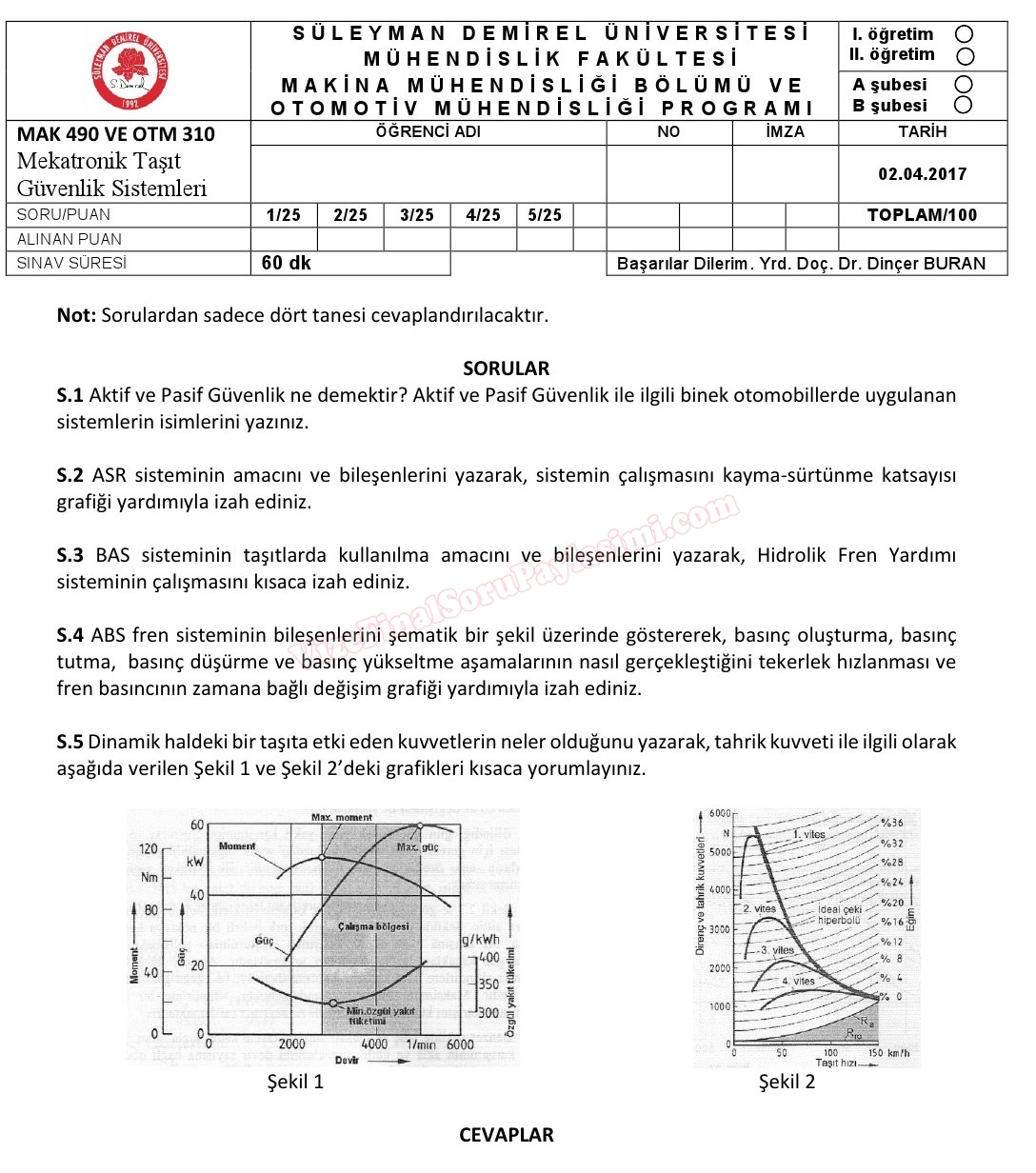 Vize ve Final Soruları / Süleyman Demirel Üniversitesi / Mekatronik Taşıt ve Güvenlik Sistemleri