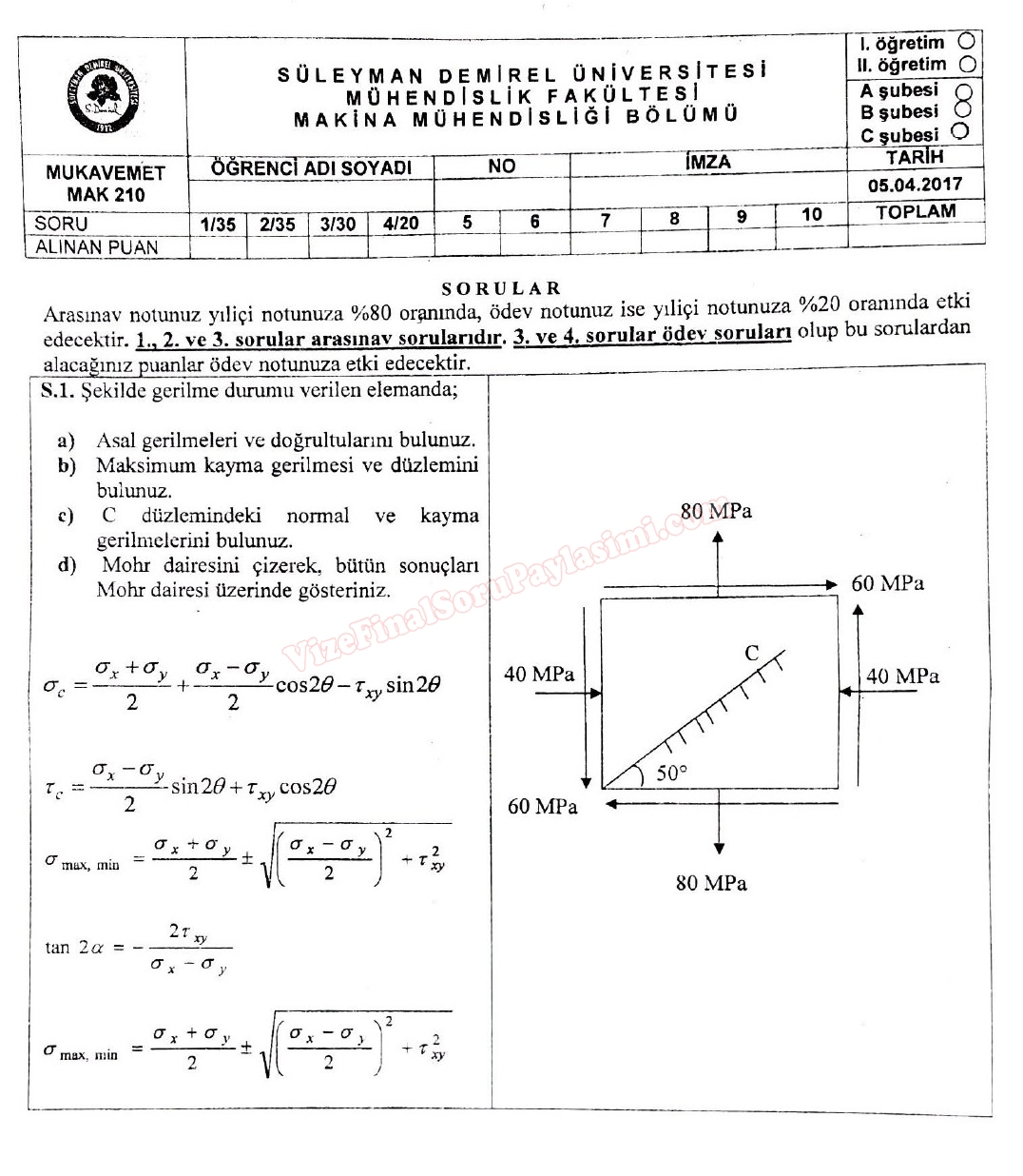 Mukavemet -1 mukavemet vize soruları Vize Soruları ve Cevapları Süleyman Demirel Üniversitesi SDÜ 2017 GERİ DÖN-